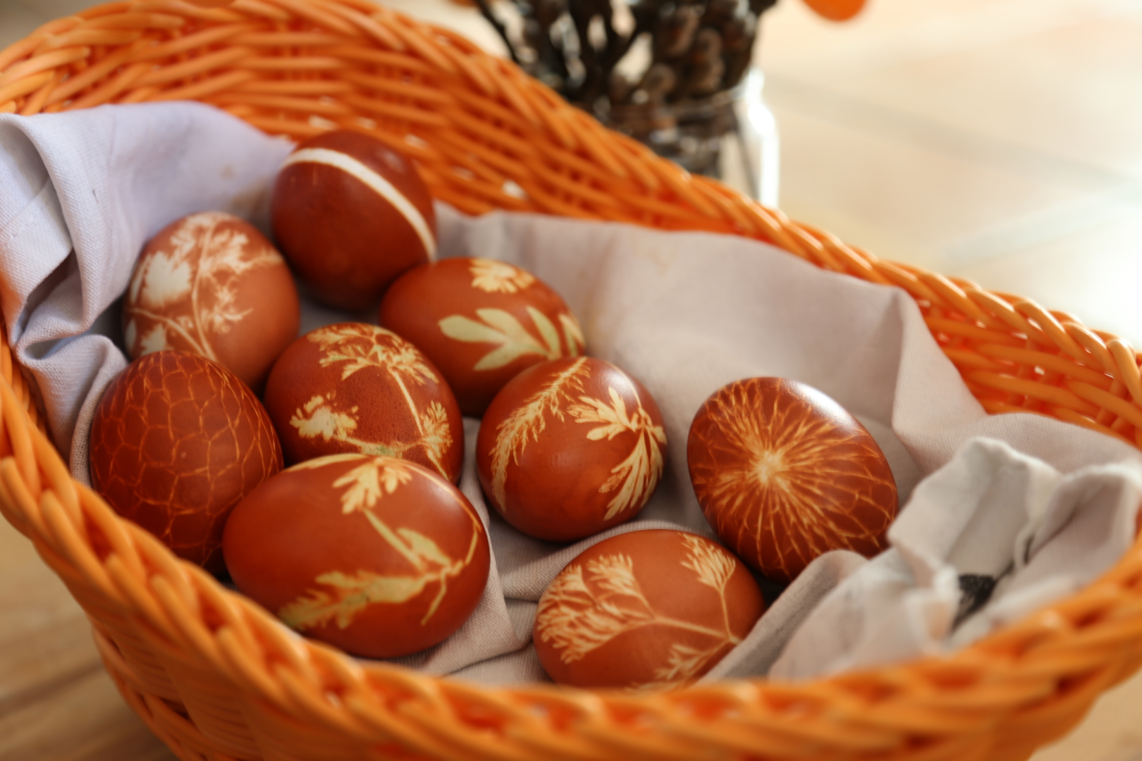 The technique we use most often is very “old school”. While the artificial colours you buy in a store give variety of shades, sometimes they also leave colour stains in the eggs and that is not the healthiest thing. For the last couple of years we have been going back to the most traditional way – making coloured eggs with the help of the onion peel. So how do we do it? First of all you need to start collecting the onion peel already a month or two prior to Easter. It doesn’t matter what peel you take – from yellow or red onions, as long as you gather a lot of it. If you will have more red onion peel the colour might turn darker, more yellow – a little more subtle brown. Once Easter arrives all you still need are some eggs (white shell is not a must) and you gather some first spring flowers and leaves from your garden. You take the egg and a flower, wrap it very tightly with an old nylon sock that you cut into pieces to cover the egg and then lay those eggs into a big-enough pot filled with onion peel. Pour water over the pot and let it cook until boiling on low temperature, for at least 10 minutes after boiling. When that time passes you should leave the eggs inside of the water for another hour. Once you start unwrapping them, you need a cloth dipped in with a few drops of olive oil that you wipe across the egg lightly and then lay them into a basket. The eggs turn out beautifully brown with patterns from nature – each one is unique. Of course there are some more organic ways of painting the eggs – a popular one recently has been cooking the eggs in spice curcuma, in red beets, some people even do it in red wine, etc. We don’t mind the spice or veggies, but in our family we prefer drinking the wine.